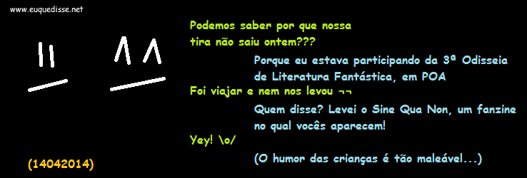 ![]() Sim! O EUqueDISSE participou da 3ª Odisseia de Literatura Fantástica. Lá encontramos gente muito, muito, muito legal, e ainda distribuímos o Sine Qua Non, um fanzine feito por essa que vos fala em parceria com Mushi-san (do site http://0mnia.mushi-san.com/. Se você pegou um de nossos fanzines, leia, comente e diga o que achou. Se não pegou (quer porque não esteve no evento, quer porque não ganhou um), pode puxar a versão dele em PDF clicando aqui! | ||||||