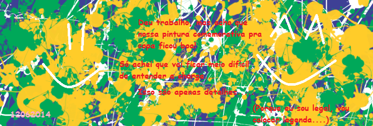 ![]() (Legenda, porque necessário é....) "Deu trabalho, mas acho que a nossa pintura comemorativa pra copa ficou boa!" "Só achei que vai ficar meio difícil de entender a charge." "Isso são apenas detalhes...." (Porque eu sou legal, vou colocar legenda) (12062014) PS: Última charge tem agradecimento especial a @mushisan (visite o site em livro.mushi-san.com , que gentilmente fez o fundo... ou você pensou mesmo que quem pintou foram as carinhas? | ||||||
