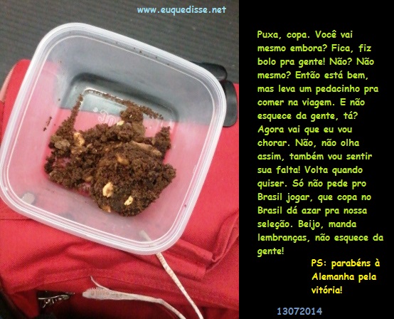 ![]() (Legenda) Puxa, copa. Você vai mesmo embora? Fica, fiz bolo pra gente! Não? Não mesmo? Então está bem, mas leva um pedacinho pra comer na viagem. E não esquece da gente, tá? Agora vai que eu vou chorar. Não, não olha assim, também vou sentir sua falta! Volta quando quiser. Só não pede pro Brasil jogar, que copa no Brasil dá azar pra nossa seleção. Beijo, manda lembranças, não esquece da gente! PS: parabéns à Alemanha pela vitória! (09072014) | ||||||