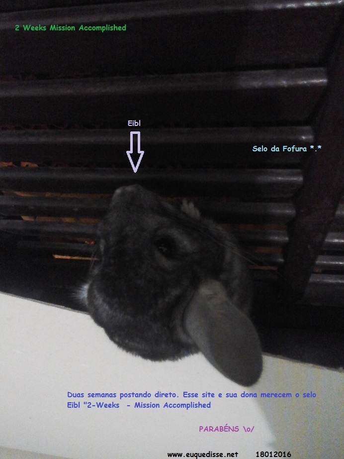 ![]() (Legenda) [Foto de um chinchila numa janela] 2 Weeks Mission Accomplished Eibl [com seta apontando o chinchila] Selo da Fofura *.* Duas semanas direto. Esse site e sua dona merecem o selo Eibl 2 Weeks Mission Accomplished PARABÉNS \o/ (18012016) | ||||||