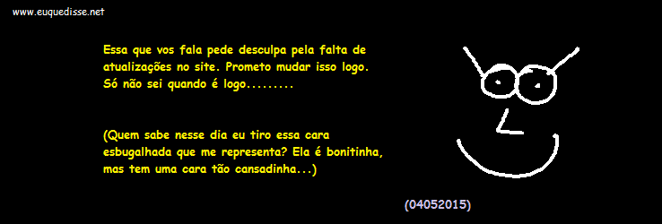 ![]() (Legenda) Essa que vos fala pede desculpa pela falta de atualizações no site. Prometo mudar isso logo. Só não sei quando é logo......... (Quem sabe nesse dia eu tiro essa cara esbugalhada que me representa? Ela é bonitinha, mas tem uma cara tão cansadinha...) 04052015 | ||||||