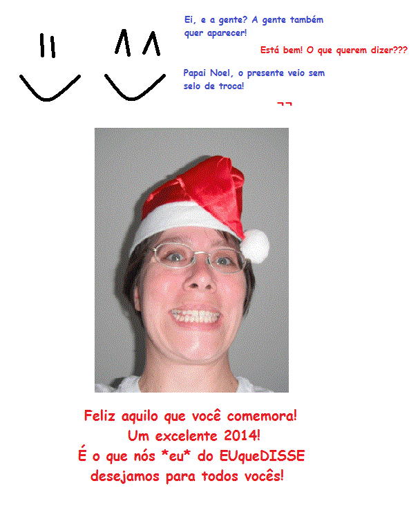 E do outro lado do sistema solar estava... eu. Olhando para vocês, humanos, e pensando: por que juntar duas festas tão legais num mesmo período? Para poder aproveitar melhor! Claro! Para ter desculpas para ficar de folga nesses dias. Para poder ficar sem fazer absolutamente nada enquanto se espera pela outra comemoração. Ou simplesmente para poder ter desculpa para se ter dois feriados tão bons num período tão curto de tempo. Feliz festas de final de ano a vocês e todos os seus 8D (25122013 - publicado em 01012014) . . . . . . . . . . . . . . . . . . . . . . . . . . . . . . . . . . ![]() Notas: Glu-Glu, Antônio e Jheanie são personagens de "As aventuras do Capitão Glu-Glu". Jack, claro, é o nosso personagem principal em "Manual Prático do Turista acidentado". Simone, César e Alex são personagens de "O Espião", história em que, eventualmente, aparece também a família real de Grundniev, embora eles sejam mesmo personagens da história enorme que escrevi e que ninguém quer ler (se quiser, avise, são só 1800 páginas! ;) ), cujo nome provisório é "Além da realeza". E Cícero aparece no livro em que estou trabalhando atualmente - nome provisório, Jennifer. E você também pode aproveitar tudo que acontece nas nossas desventuras na Terra pelo Aliens Anônimos ou nossas discussões filosóficas nas Charges do EUqueDISSE. Tenham todos um bom ano 8D | ||||||